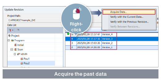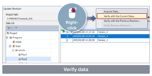 Sequence control and motion control programs are combined into one. There is no need to create separate programs for each module or exchange data, simplifying your programs. With a single tool handling both sequence and motion control programs, you can easily modularize the program into components, manage change history, and debug.
