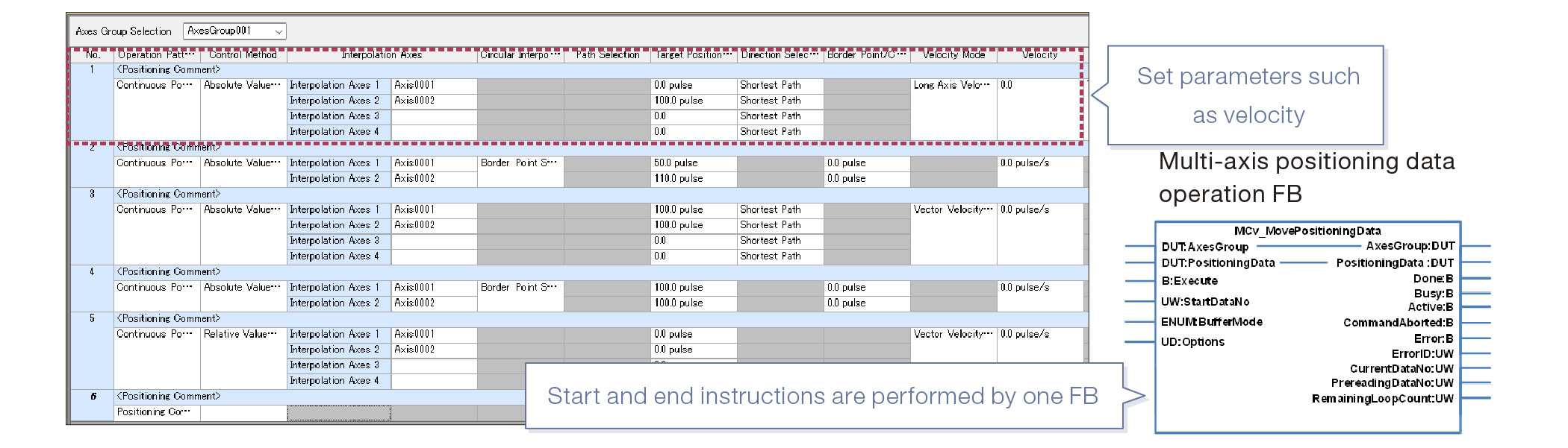 You can set multi-axis positioning data (point table) from a dedicated window. Continuous positioning can be performed with one FB.