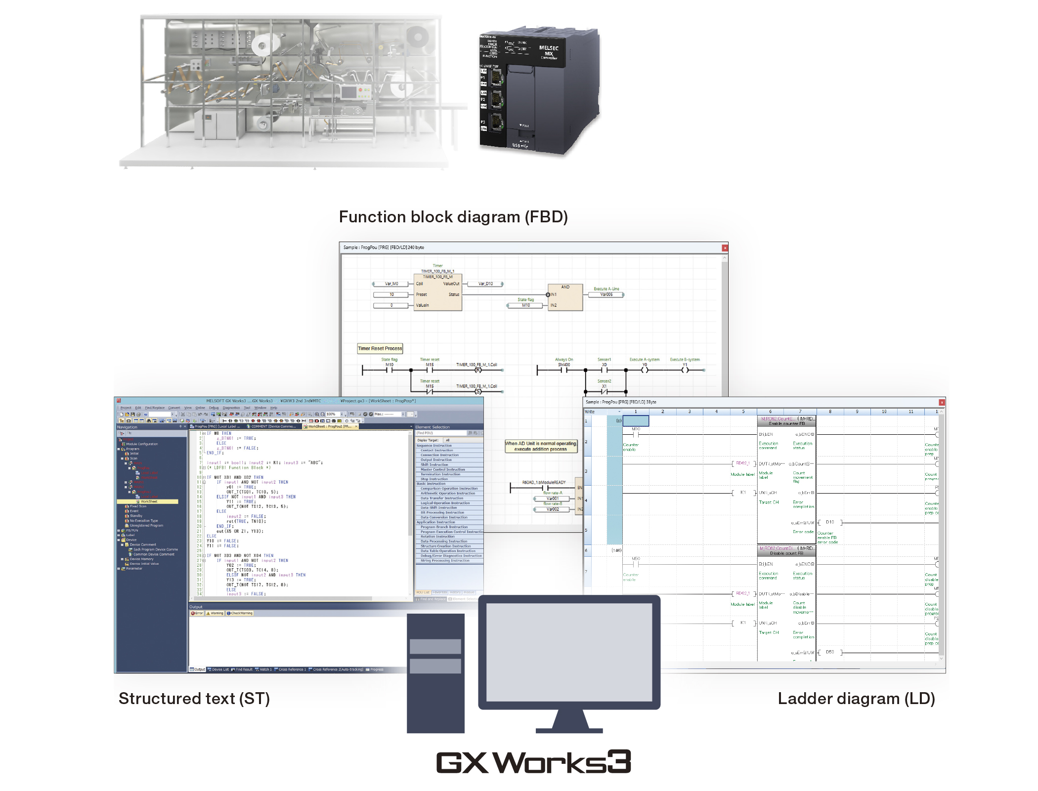 Ladder diagram (LD), structured text (ST), and function block diagram (FBD) are supported. Motion control programming also supports LD, ST, and FBD, allowing the use of FBs that conform to the international PLCopen® Motion Control FB standard.