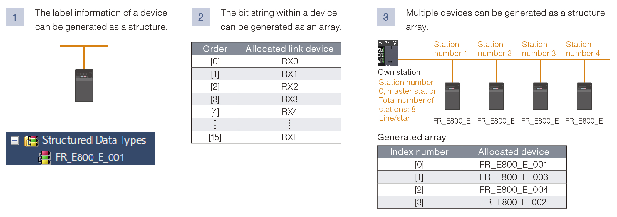 By defining elementary data types, structures, and FB types as an array, the same FB can be declared/described at once. The program can be simplified because there is no need to call the same FB again.