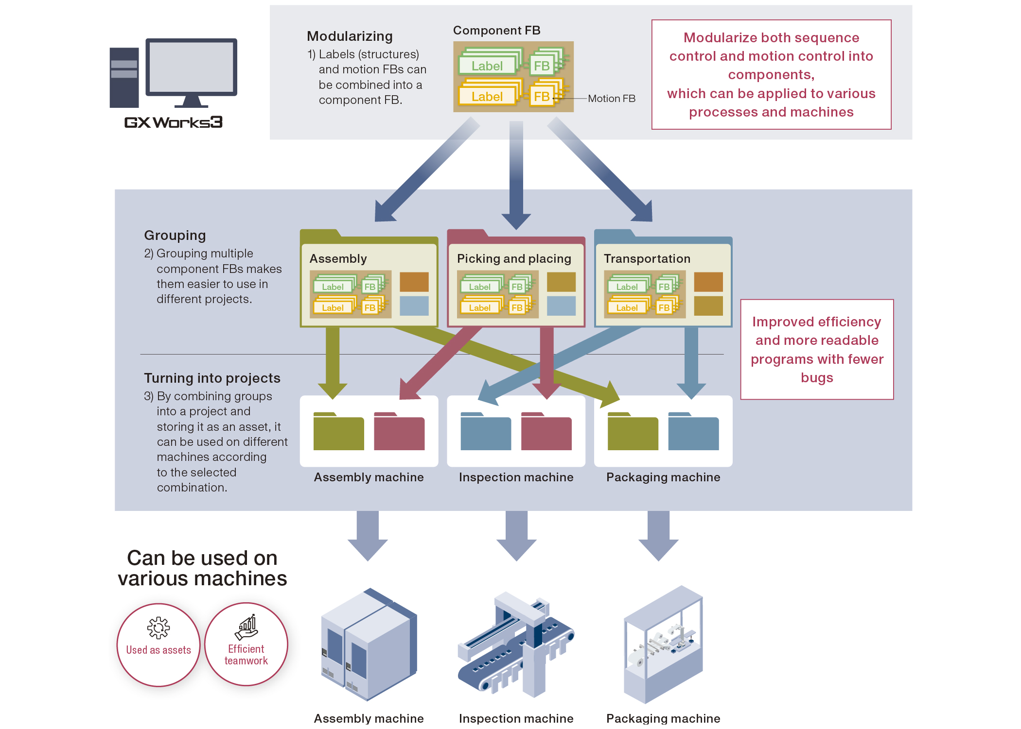 Increase program reusability by using label names, FBs, structures, and arrays to modularize a program into components. This approach not only reduces development time but also creates more readable programs. It also ensures consistent programming quality regardless of developer skill level. Each component can be assigned to a specific member, clarifying roles and responsibilities.