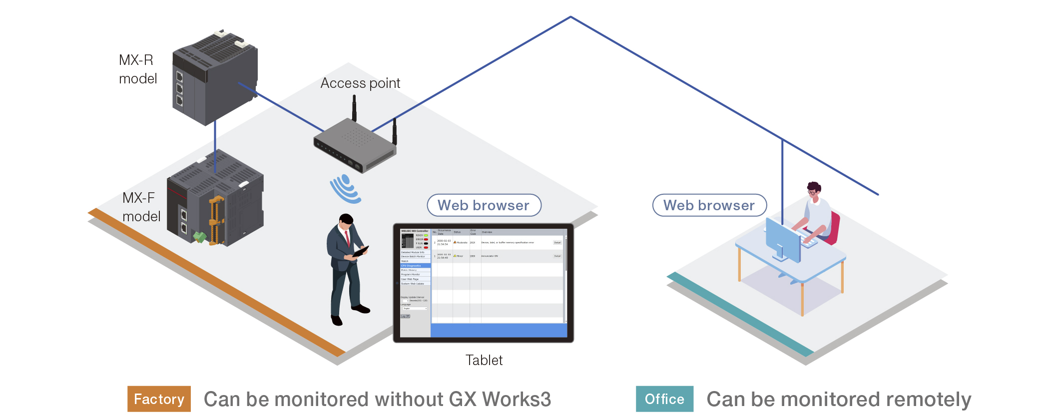 The web server function allows you to monitor equipment status from various devices such as personal computers, tablets, and smartphones.