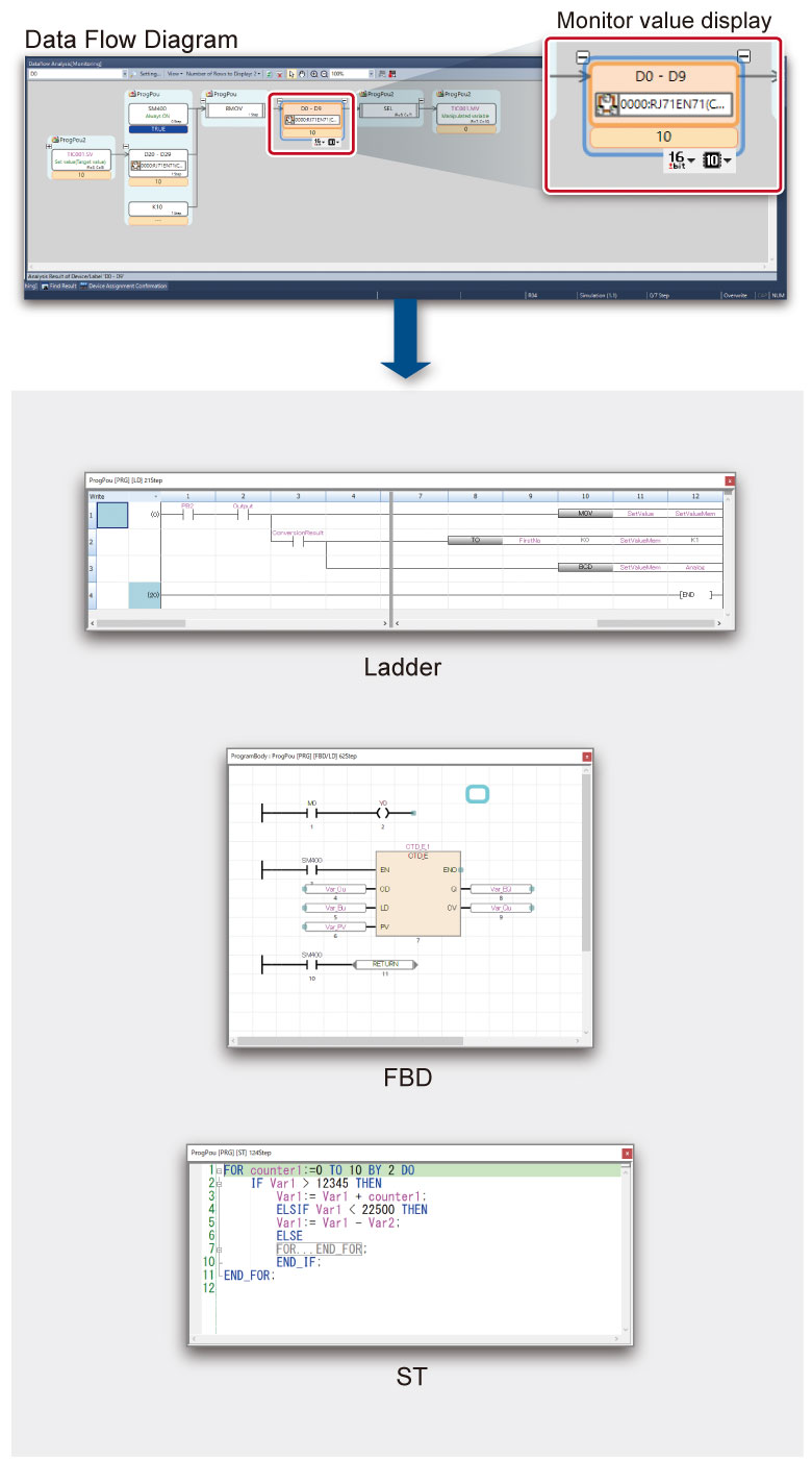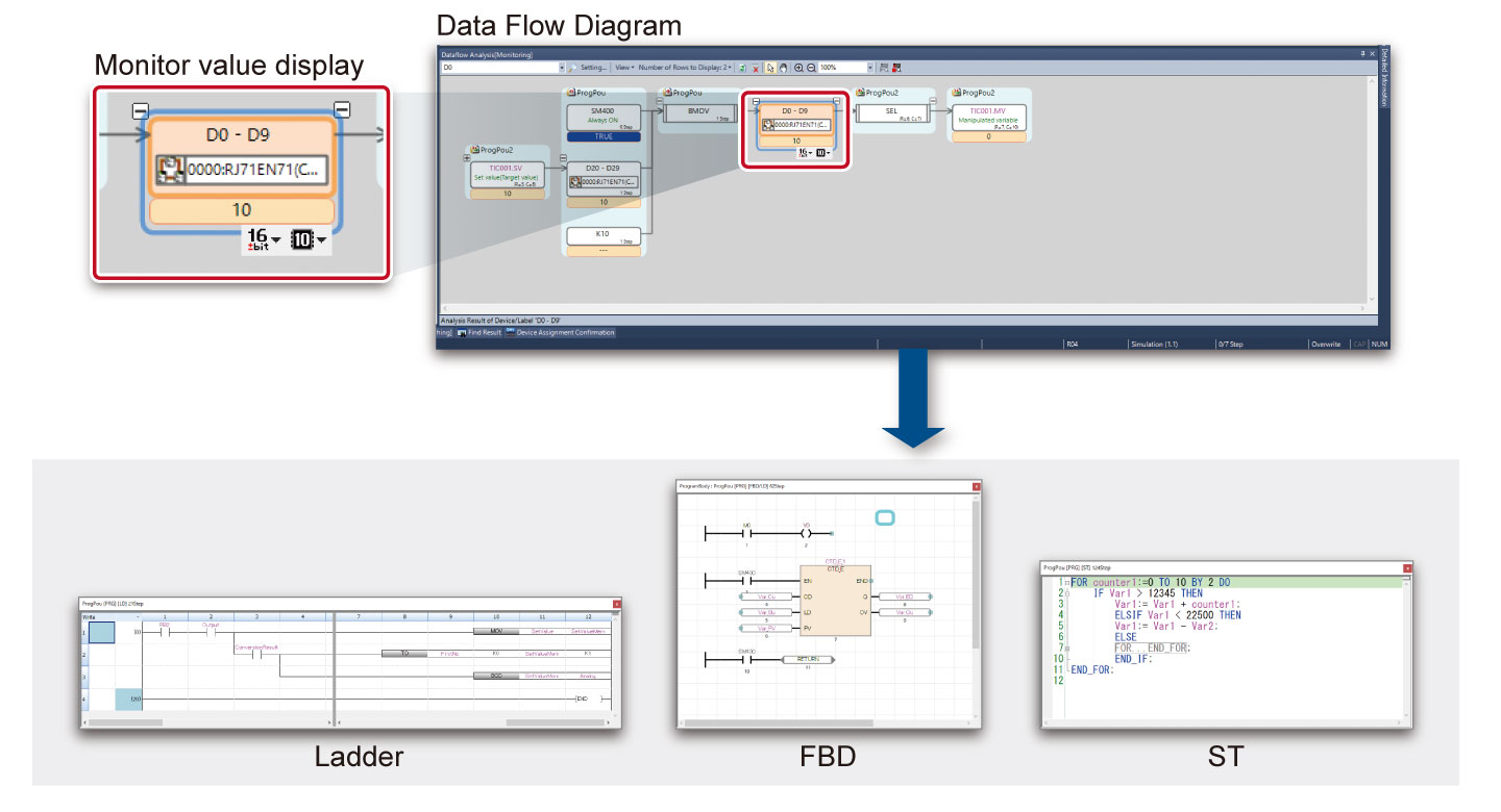 Select data of interest (device or label) to visually display related data that affects changes in the selected data in a flow diagram. You can jump from the flow diagram to the corresponding part of the program, making it easy to identify the cause.