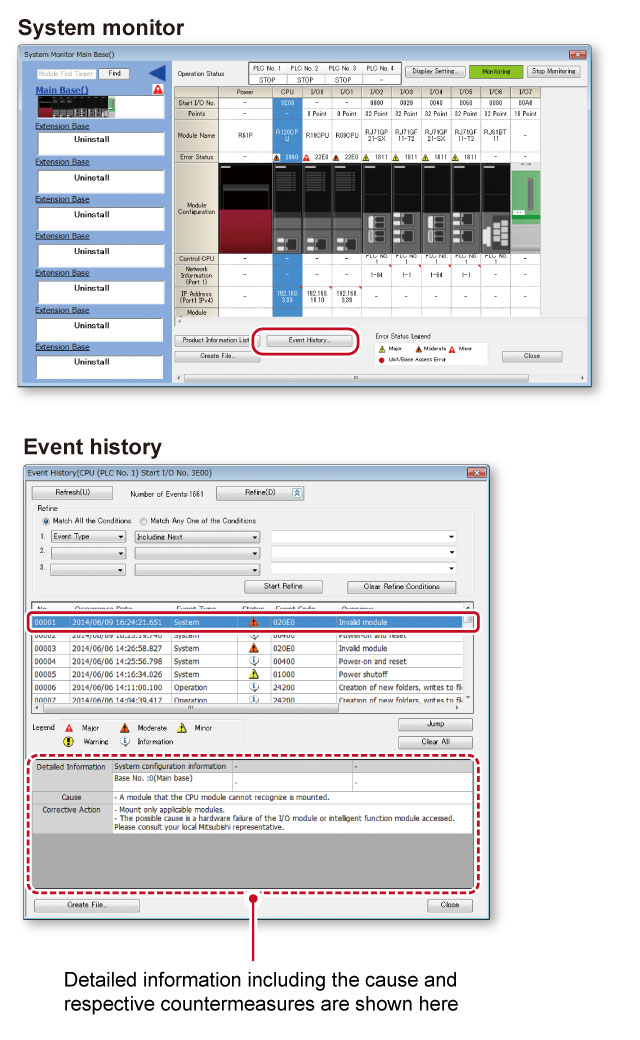 MELSOFT GX Works3 incorporates various maintenance features helping to reduce downtime and keep productivity high. Various levels of maintenance are possible, from system-wide monitoring of errors and module status to monitoring at the network level; for example, detailed operations that show where programs or parameters have been changed in the CPU and the monitoring of system events, which also includes a useful historical function that can be exported as a CSV file.