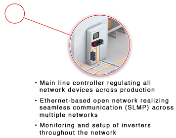 Big Data analytics requires deterministic data collection, which can be realized by incorporating two key features: SLMP*1 that enables seamless connectivity between devices in the IT layer and on the shop floor; and a high-speed, large-capacity 1 Gbps communications network that enables the handling of large-data, such as production, quality and control data between different production processes.