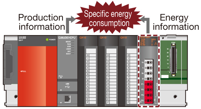 - Allows for easy specific energy consumption*3 management by matching the “production information” of the CPU module with the “energy information” of the energy measuring module.