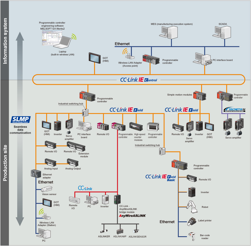Seamless data communication through Ethernet, CC-Link IE, and CC-Link allow easy access to information, no matter where it resides on the network. Through this technology, it is possible to “drill down” from the Enterprise or IT layer through multiple networks accessing programming controllers using GX Works2 programming or other related software.