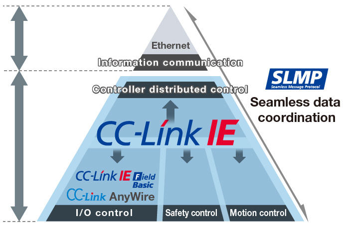 Enhanced information communication by networking is the essential requirement in the automation industry. The MELSEC-Q Series provides an open and seamless network environment integrating the following different level of automation networks: CC-Link IE; high-speed and large capacity Ethernet-based integrated open network that connects shop floor and IT system as the core of e-F@ctory, CC-Link; SEMI certified global standard network originating from Japan and Asia, and AnyWire; sensor level distributed control network.