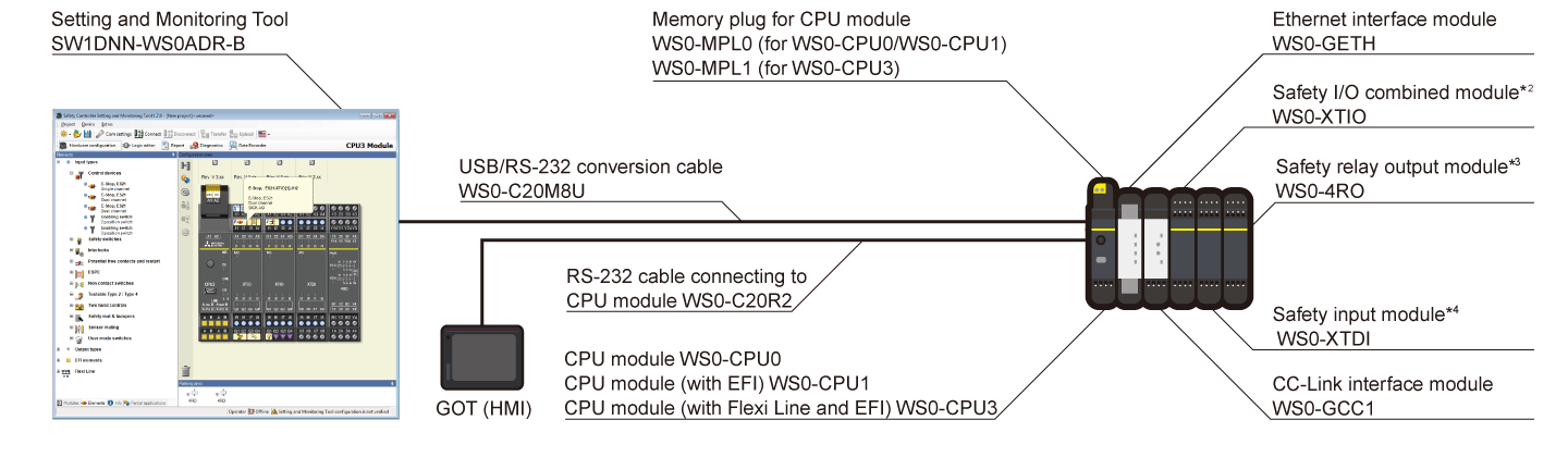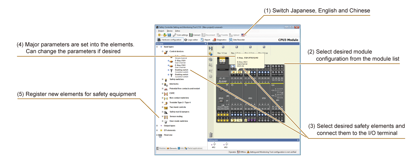 - *7. Connecting parameters of major safety equipment, such as emergency stop switches, safety door switches and safety light curtains, are expressed by an icon. Make settings simply by drag-and-drop decision. Elements for safety devices of Mitsubishi’s partners are also available. Please contact your local Mitsubishi representative.
