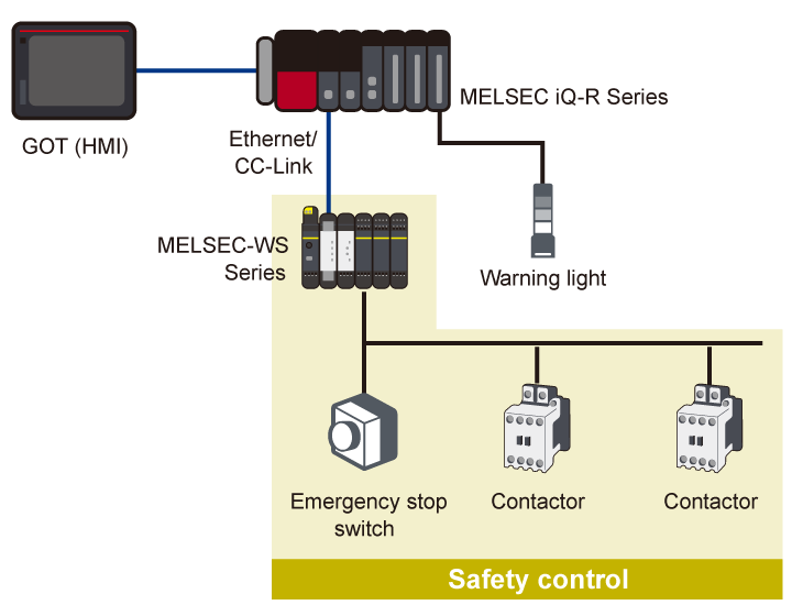 Connecting the safety controller to CC-Link, safety control can be performed with the existing MELSEC iQ-R/Q/L Series module. Furthermore, operation status and error status of the safety controller can be monitored with the programmable controller. This helps quickly identifying the factor of emergency stop and faulty equipment.