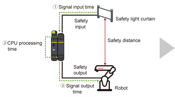 The fast shut off function that enables the safety I/O module to shut off safety output without going through the CPU module realizes a response time of 8 ms. Since similar response time is achieved even with increased I/O points, the safety distance can be shortened even in the large-scale safety system.