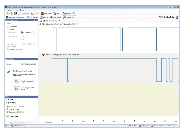 ON/OFF status of safety input signal and safety output signal processed by the safety controller can be stored.*8Results recorded on the Setting and Monitoring Tool can also be viewed on the computer to utilize for troubleshooting.