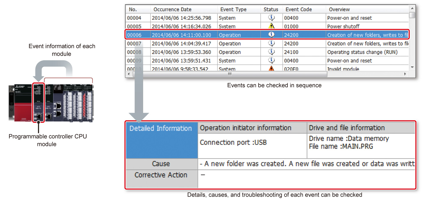 - Operation and system historical events are automatically recorded in the programmable controller CPU module