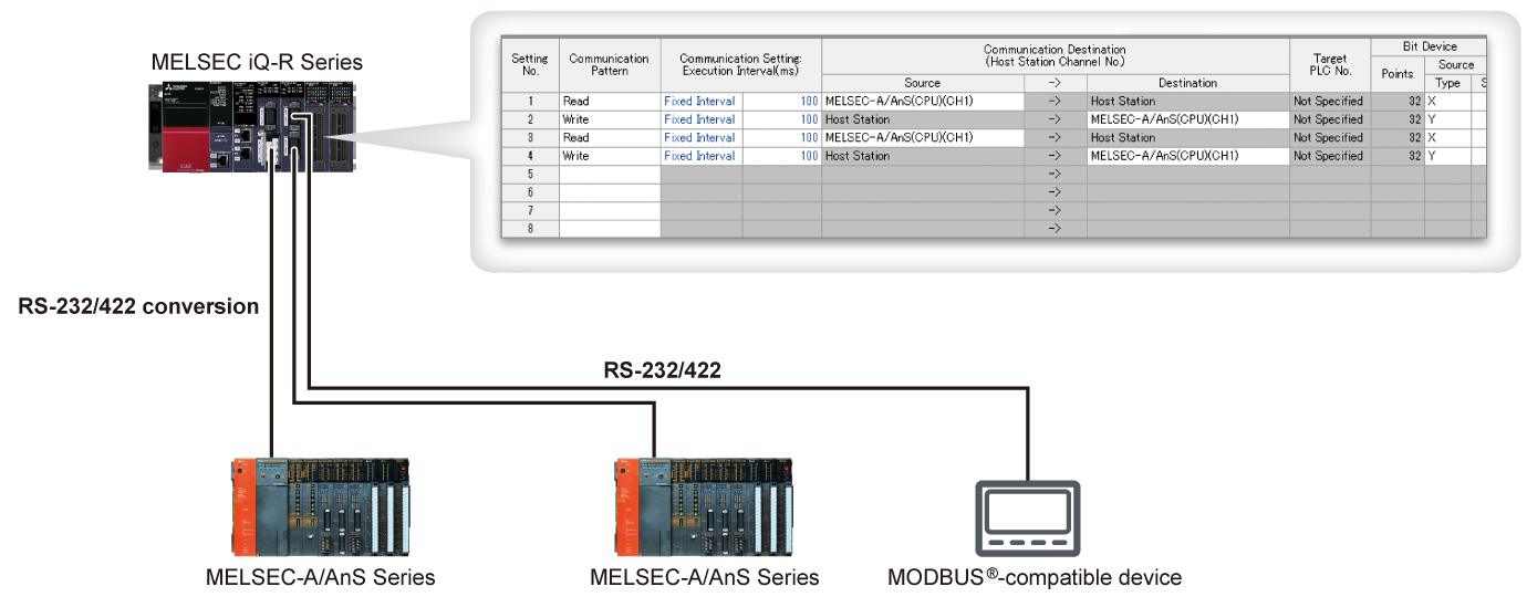 - Just by registering parameters, easy device data exchange with the existing MELSEC-A Series and MODBUS®-compatible devices is possible