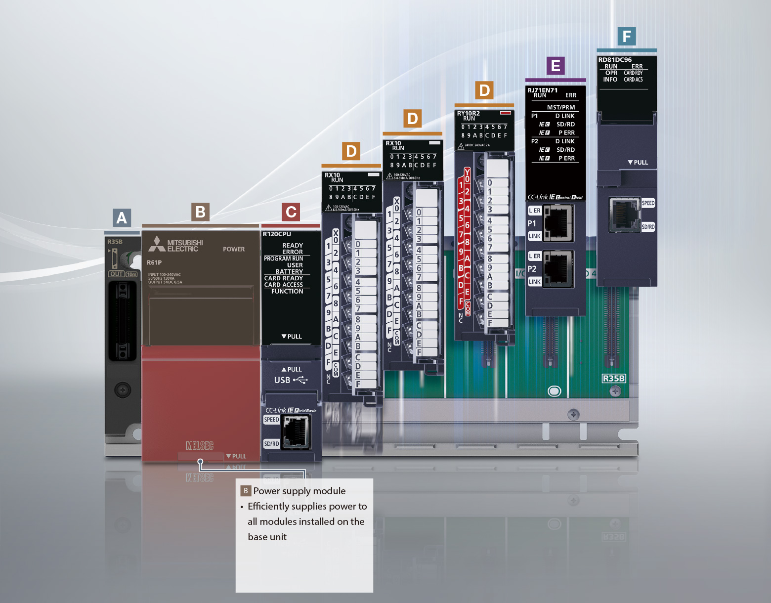 The MELSEC iQ-R Series is a modular control system equipped with various modules, each having its own responsibility in a system, enabling selection of appropriate modules according to the application.