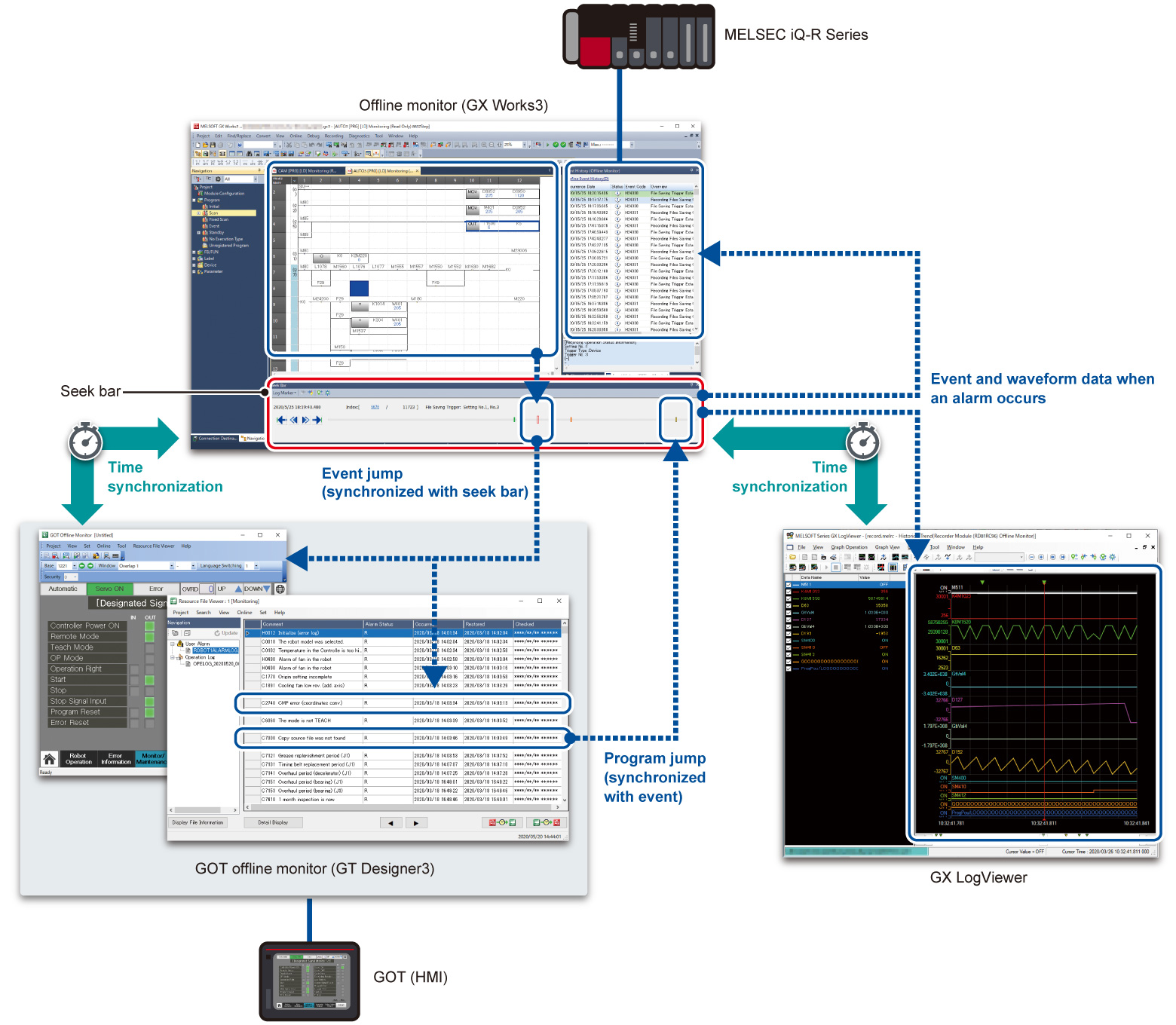 - Using the “seek bar” enables to jump back and forth within the timeline synchronizing data between GX Works3 program monitoring (circuit monitor), GX LogViewer (waveform display), and GOT (HMI) (screens, operation logs, alarm history)