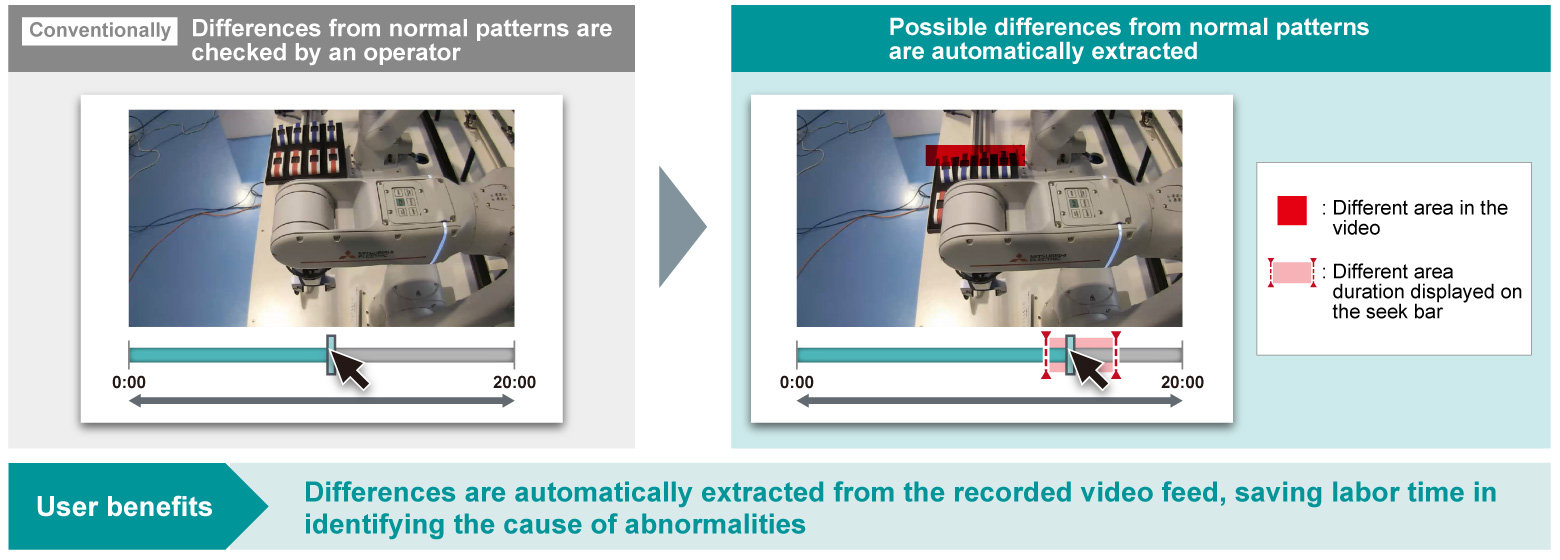 Differences are extracted according to changes in “appearance” and “operation”, then marked on the video feed automatically.