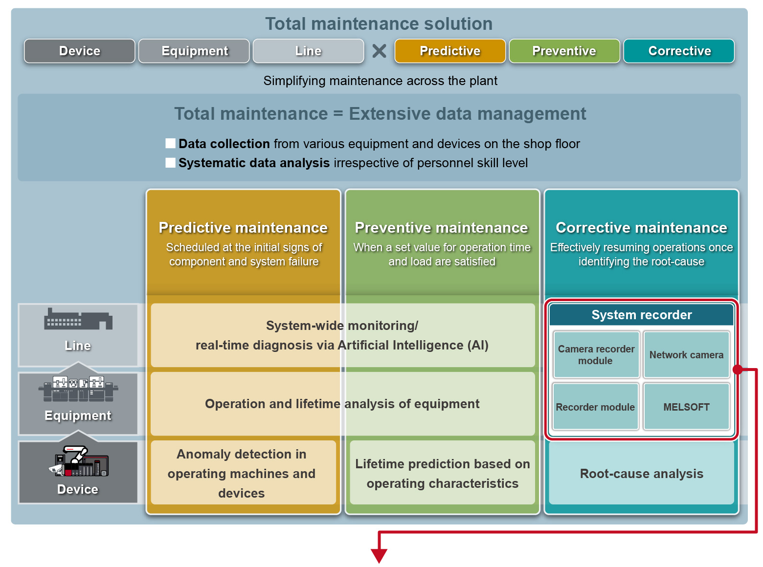 Maintenance is critical for ensuring continuous production. Maintenance includes ❶predictive maintenance to detect signs of error, periodical ❷preventive maintenance, and ❸corrective maintenance for prompt troubleshooting at the time of failure. Mitsubishi Electric proposes an enhanced maintenance solution by recording and sampling production and machine operating data and utilizing this data within various stages of maintenance.