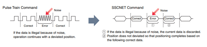 There were problems with both pulse-train command and analogue command: former had a limited pulse frequency for a high-speed and high-accuracy control, and the latter was vulnerable to the line noise, voltage drop due to the cable length, and temperature drift.