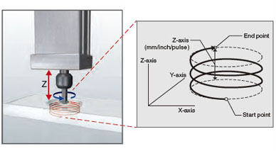 Helical interpolation draws a helical path by a linear interpolation axis (Z-axis) following to 2-axis circular interpolation control (X-axis and Y-axis). For applications that require the boring of deep, large holes, usually the helical interpolation of the three axes must be taken into consideration.