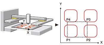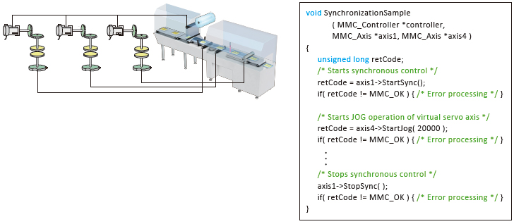 The advanced synchronous control is software-based synchronous control as an alternative to mechanical control, such as gear, shaft, clutch, speed change gear, and cam. In addition, a cam is easily generated with cam auto-generation function. The synchronous control can be started and ended for each axis, allowing the synchronous control axis and positioning control axis within the same program.