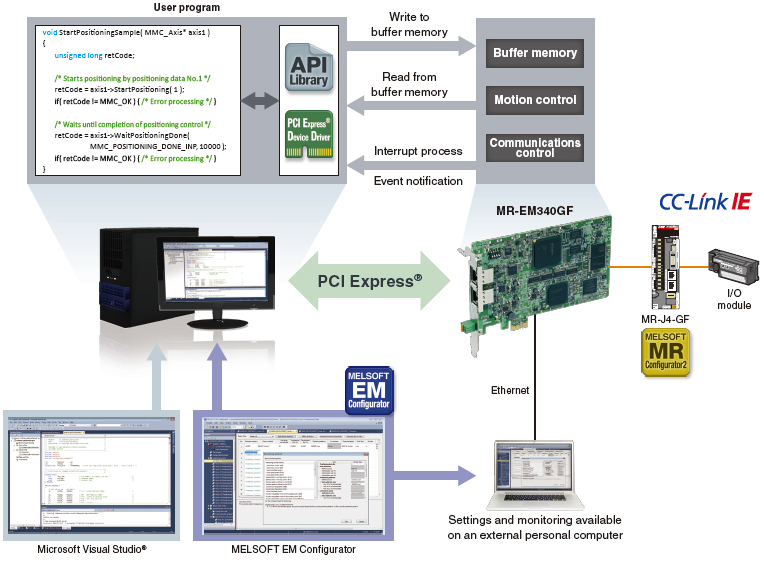 Numerous motion control functions, such as positioning, synchronous control, and speed-torque control are performed by the Simple Motion board being embedded in a PC which supports PCI Express®.
