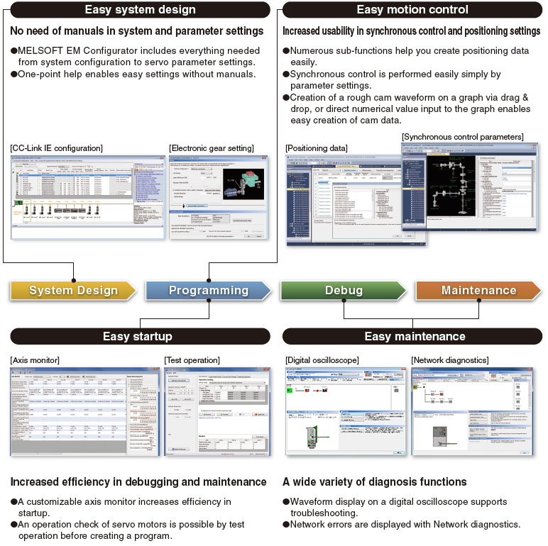MELSOFT EM Software Development Kit is a development software package, supporting the engineering process from system design and programming to debug and maintenance for the Simple Motion board.