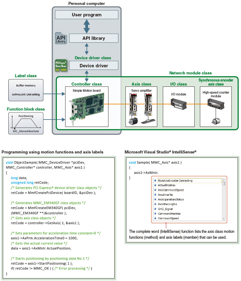 The API library is an add-on library which uses functions (method) and labels (member) of controller and axis classes, and enables easy programming with Visual C++®.
