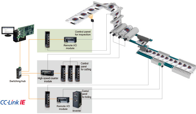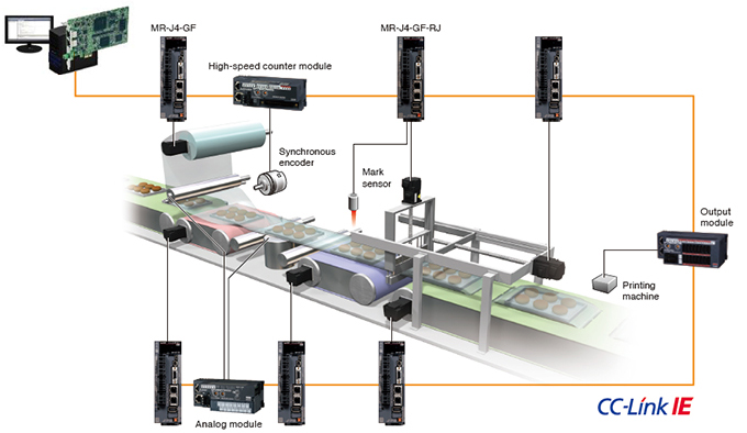 In a single network, inputs/outputs are synchronized with the command communication cycle of the servo amplifier. For example, an input from a synchronous encoder and an output to a printing machine are synchronized in the same network. CC-Link IE Field Network enables a wide range of Motion control applications.
