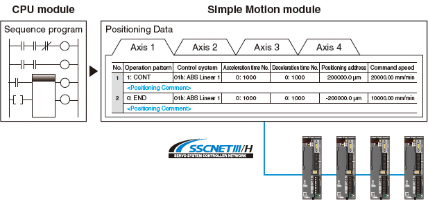 Positioning control is easily performed with a sequence program starting positioning data of a point table. To respond to extensive applications, various positioning controls are available: Linear interpolation, 2-axis circular interpolation, fixed-pitch feed, and continuous trajectory controls, etc.