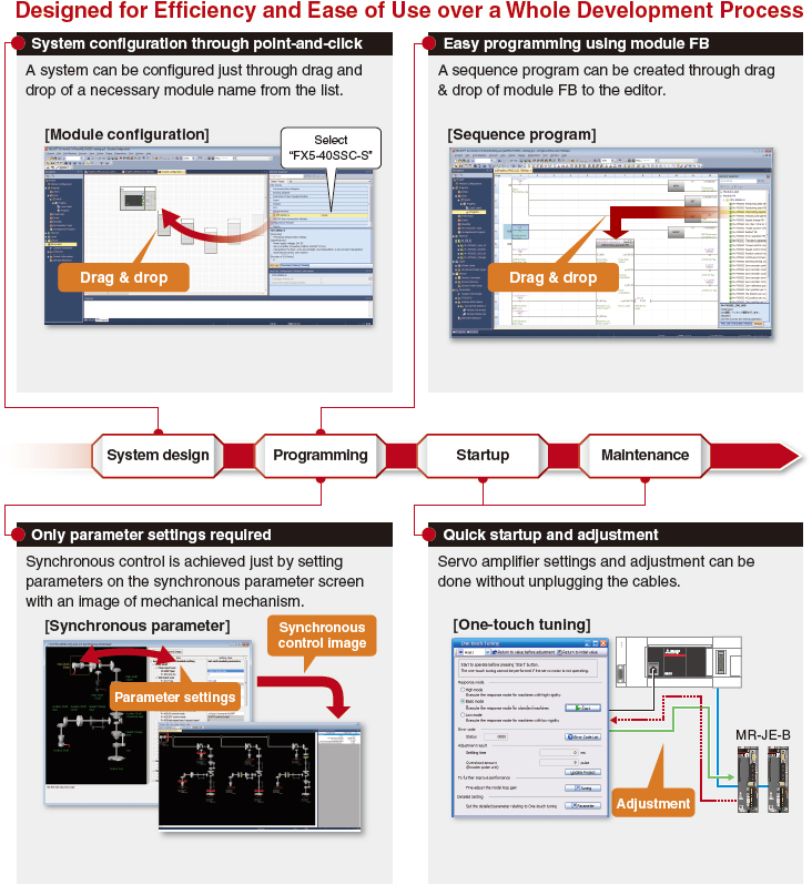This software supports the whole product development cycle - creation, startup, debugging and maintenance of sequence programs, parameters, positioning/cam data.
