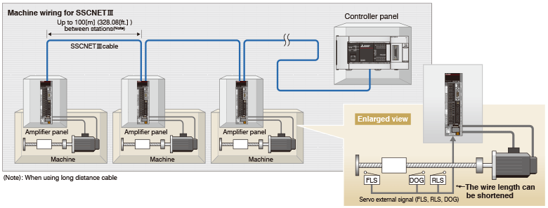 - Long distance wiring is possible up to 3200 m (10498.69 ft.) per system (maximum of 100 m (328.08 ft.) between stations x control axes up to 32 axes), suitable for large-scale systems.