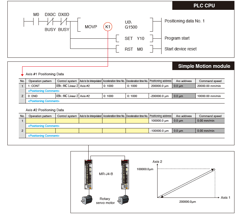 - Automatic operation can be executed by setting the positioning addresses and speeds, etc., to a sequence program.