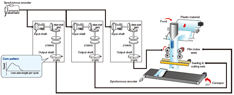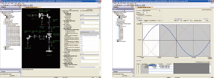 Synchronous control can be easily achieved with software by placing mechanical modules on screen, such as the gear, shaft, speed change gear and cam.