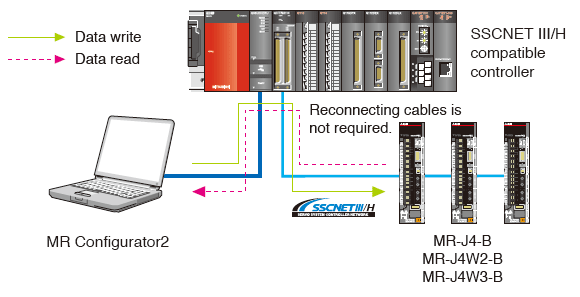 Large amounts of servo data are exchanged in real-time between the controller and the servo amplifier. Using MELSOFT MR Configurator2 on a personal computer that is connected to the Simple Motion module QD77MS helps consolidate information such as parameter settings and monitoring for the multiple servo amplifiers.