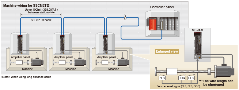 - Long distance wiring is possible up to 3200 m (10498.69 ft.) per system (maximum of 100 m (328.08 ft.) between stations x control axes up to 32 axes), suitable for large-scale systems.