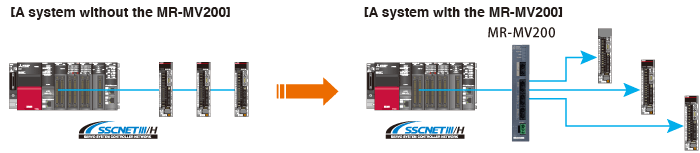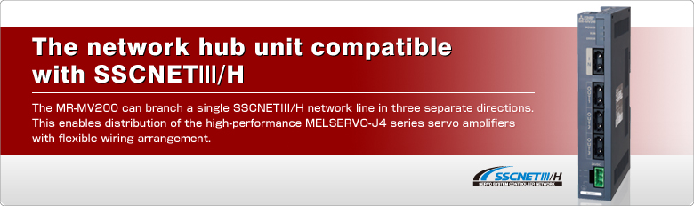 The MR-MV200 can branch a single SSCNETIII/H network line in three separate directions. This enables distribution of the high-performance MELSERVO-J4 series servo amplifiers with flexible wiring arrangement.