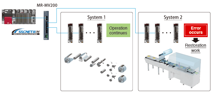 When servo amplifiers are distributed using the MR-MV200, the servo amplifiers can be turned OFF independently without affecting other servo amplifiers connected to other branched lines. This leads to significant reduction in restoration time by turning OFF only the amplifiers with errors.