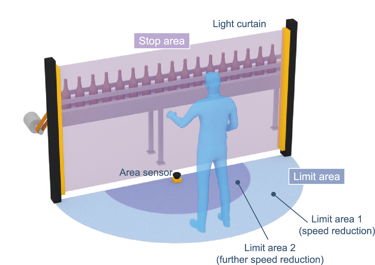 When an operator enters the limit area while a system is operating, operation of the system is not stopped and continues with a reduced speed.