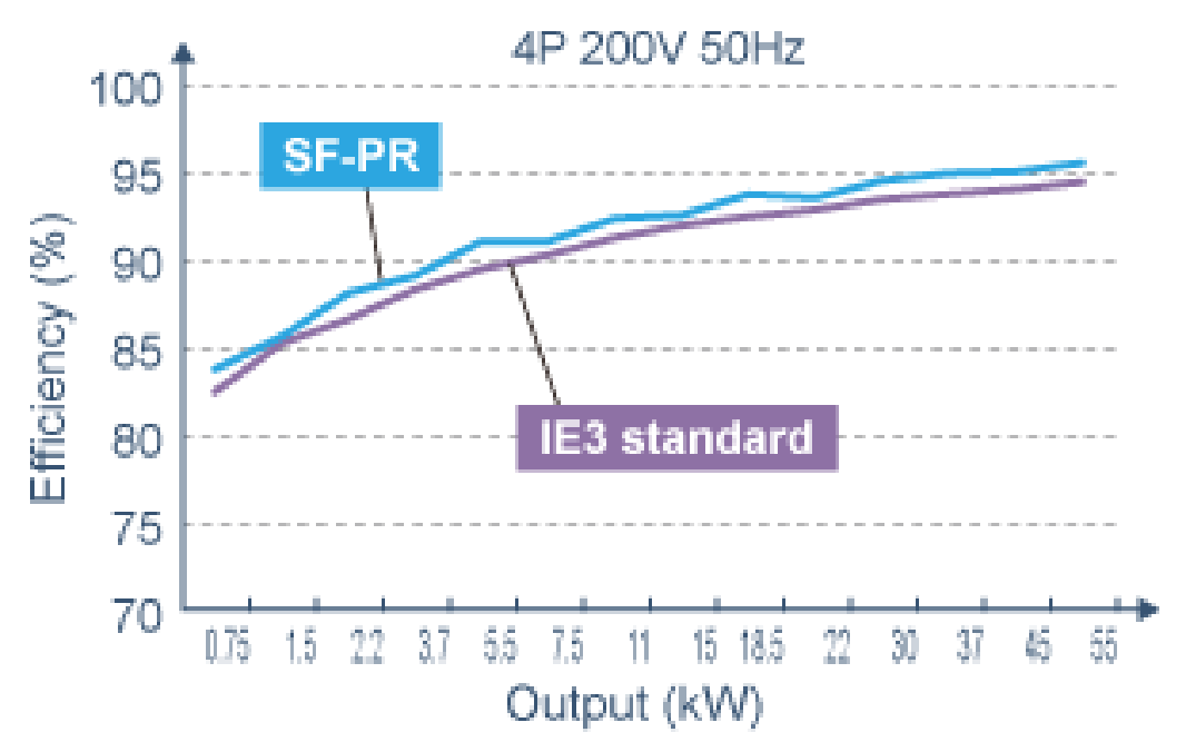 The Mitsubishi Electric SF-PR high-performance energy saving motor conforms to the Japanese domestic Top Runner Standard (IE3 equivalent). Its energy-saving operation contributes reduction in the electricity charges, which in turn lowers the running cost.