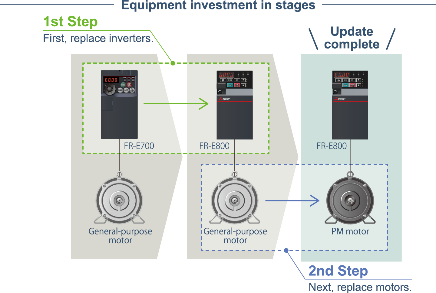 FR-E800 inverters support both induction motors and PM motors, enabling step-by-step replacement of existing devices. Users can replace inverters first and then motors. There is no need to replace them all at once.