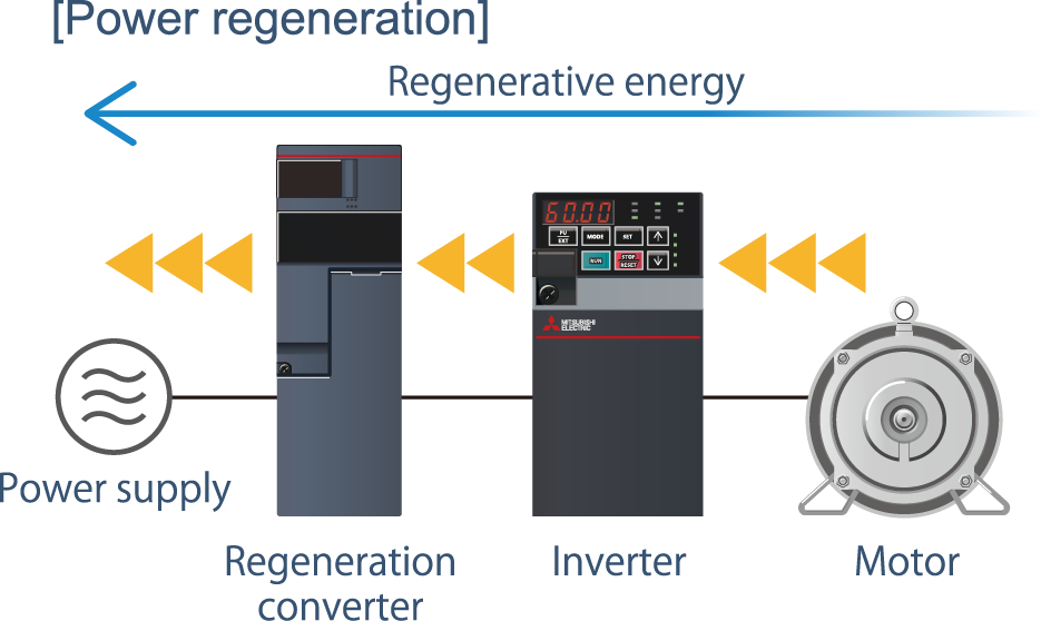 By using the multifunction regeneration converter (FR-XC) as a common converter, the power returned from an inverter during regenerative drive can be supplied to another inverter, which in turn saves energy.