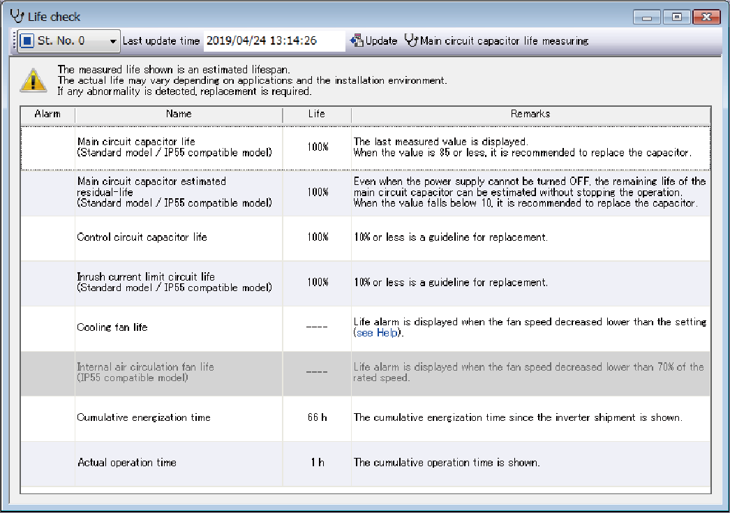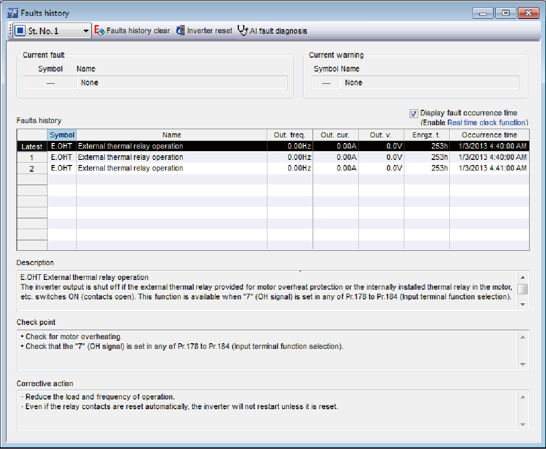 Fault records in the inverter can be displayed. When the clock function or CC-Link IE TSN communication is used, the time of fault occurrence can be displayed, too. It is possible to check the occurrence time and the type of faults, which is helpful in identifying causes of faults.