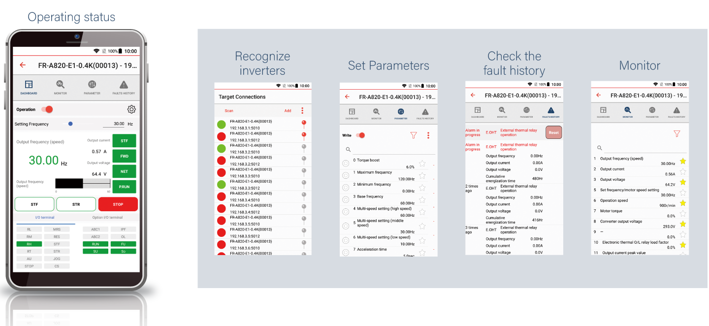 Wireless access with inverters from a remote location enables setting or changing of parameters, starting and stopping, and monitoring on the screen of mobile devices.