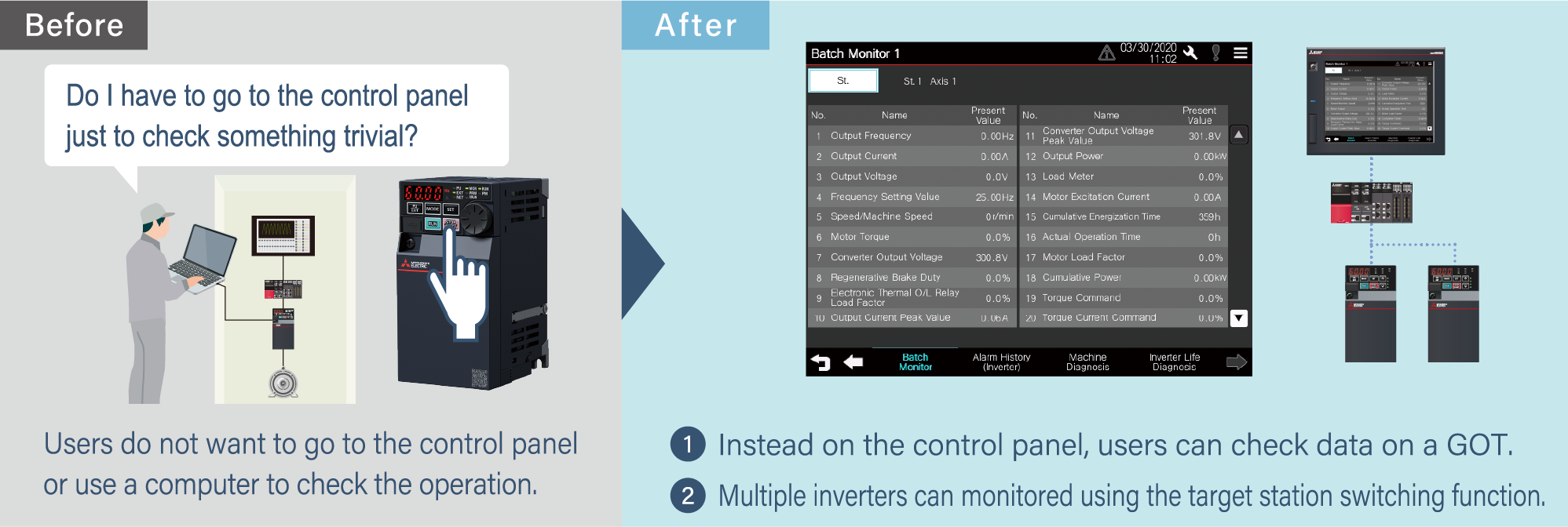 Enhanced compatibility between inverters and the GOT (human machine interface) brings various benefits to users.