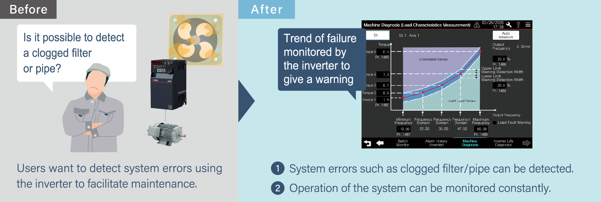 By storing the data of relationship between the output frequency and the torque during normal inverter operation, users can judge whether the load is operating in normal condition. By outputting out-of-range warnings if applicable, users can detect mechanical faults or perform maintenance.