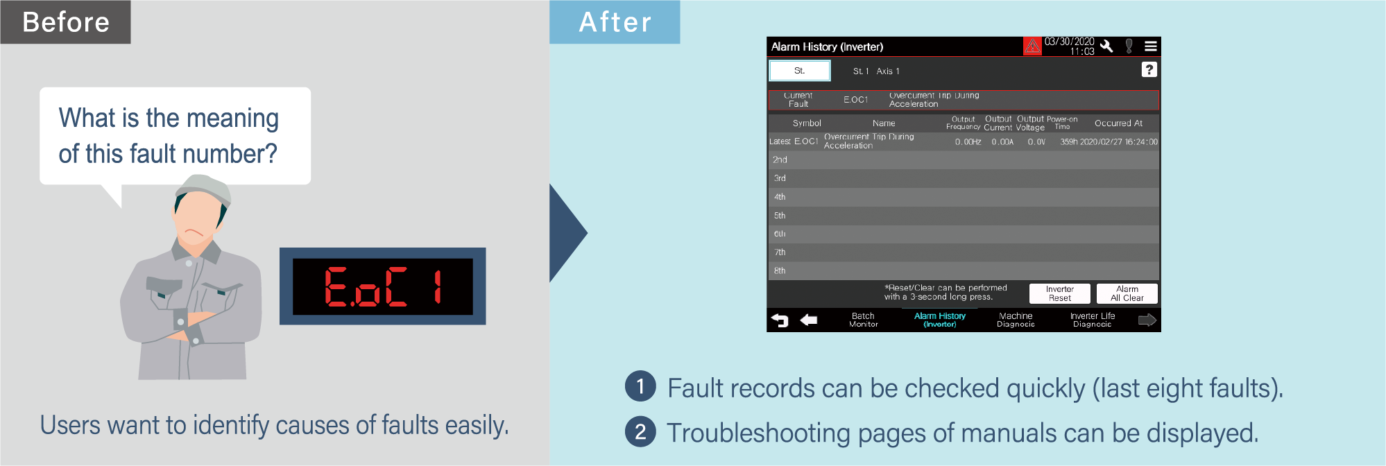 When a fault occurs, it is possible to identify the cause immediately, which contributes to downtime reduction.