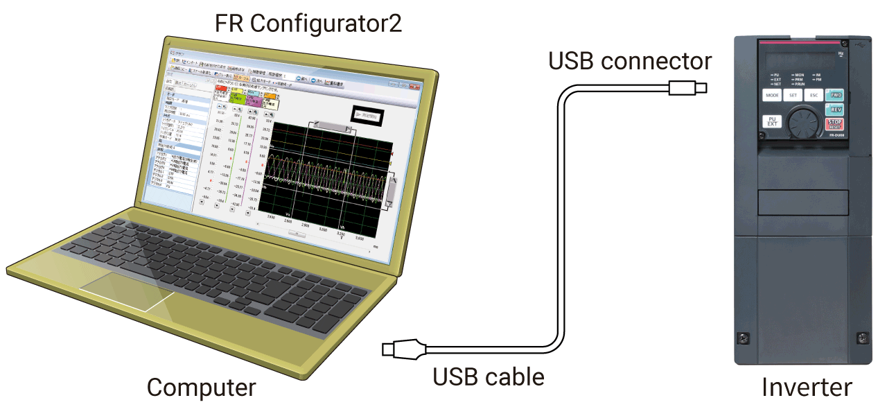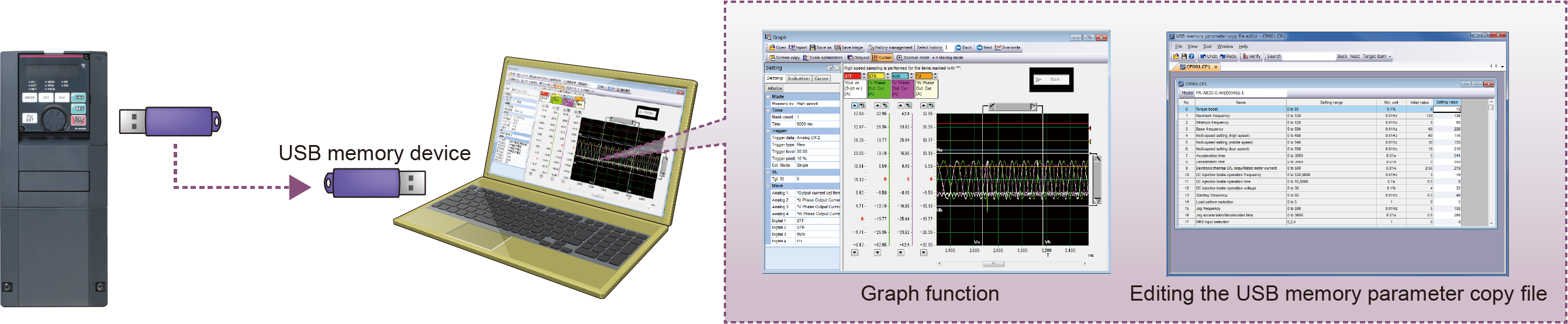By loading trace data and parameter settings copied to a USB memory device into FR Configurator2, analysis and adjustments can be carried out with ease away from the equipment.