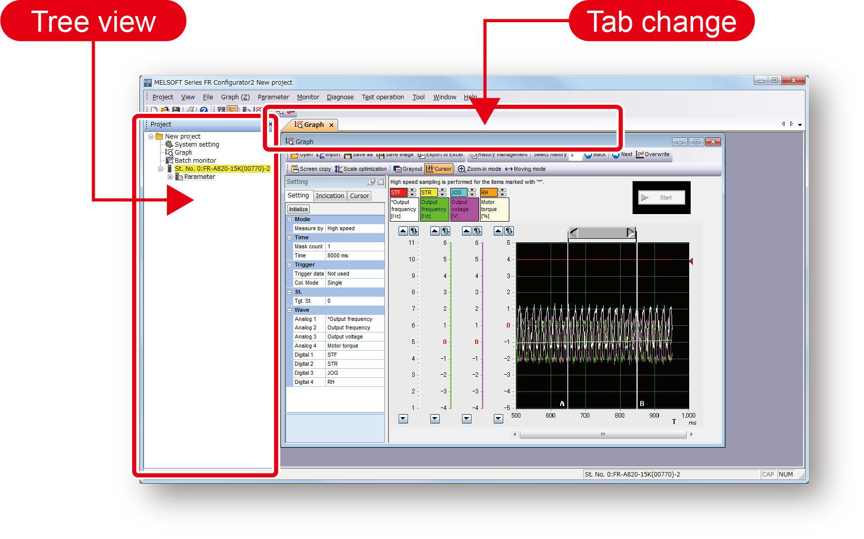 Connected inverters are displayed in tree view format. Windows for each function can be accessed by changing the tab for maximum efficiency.