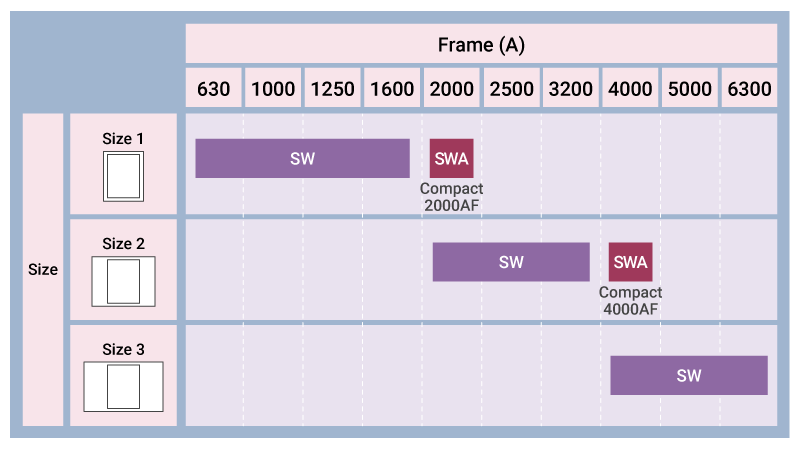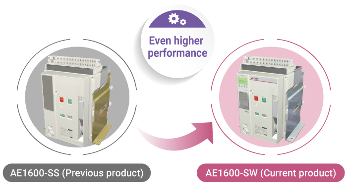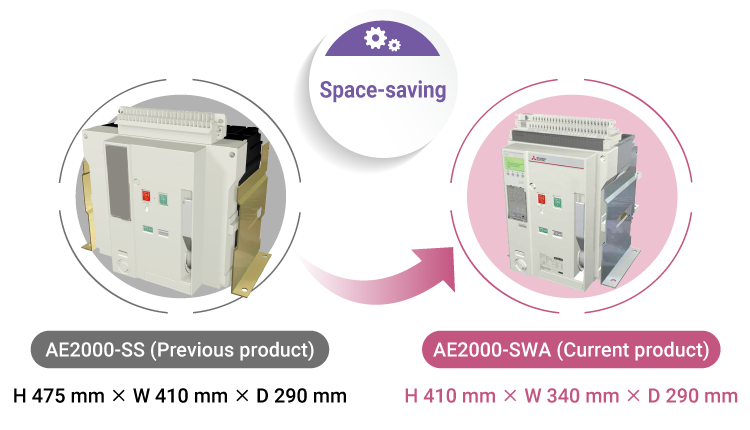 The models with 3200A or smaller frames retain the same shape as previous products but have improved performance. With the 2000/4000A frames, ACB that are smaller than previous products even with the same rated current have been added to the lineup.
